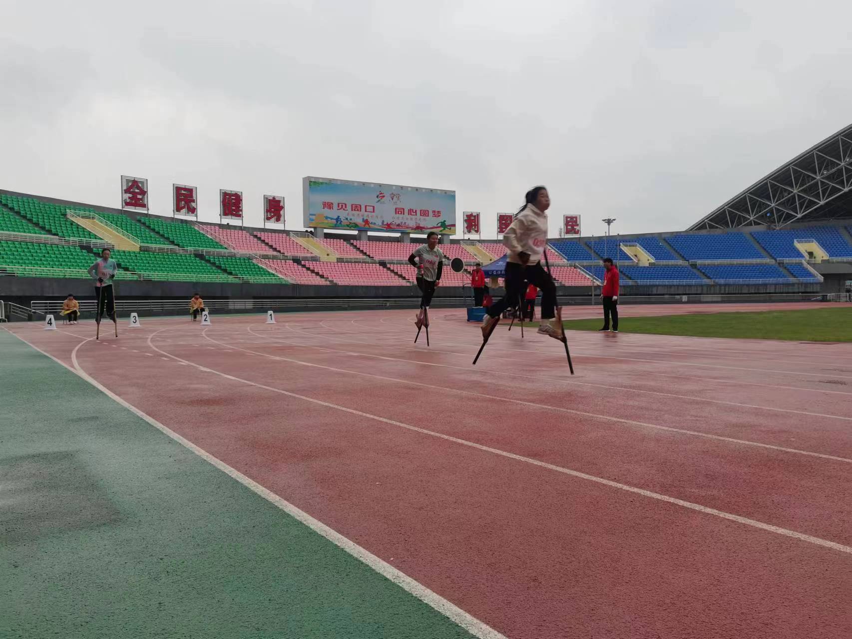 4月23日,河南省第九屆少數(shù)民族傳統(tǒng)體育運動會高腳競速項目預賽在周口體育中心田徑場開賽。隨著裁判一聲哨響,運動員們腳踩30多厘米的竹馬如離弦之箭向終點飛奔,他們在高腳馬上進行著速度和力量的比拼。