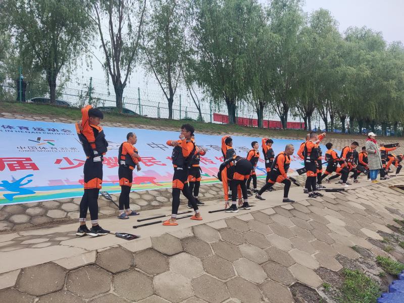 當日上午,氣溫微涼。在沙潁河水上運動中心,醫(yī)護人員、救援人員、志愿者等工作人員早早到崗,為賽事的順利進行做好了充足的準備。運動員們身穿救生衣,正在岸邊熱身,等待入場比賽。