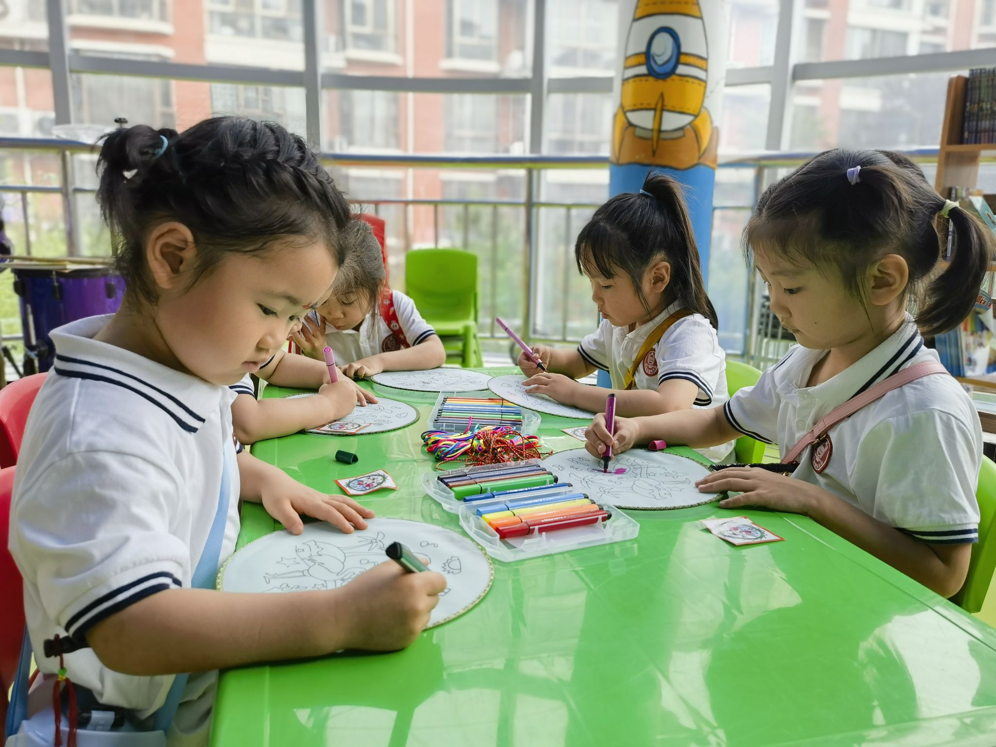 編織五彩繩是端午節(jié)的習(xí)俗之一,有祈福納吉的美好寓意;團(tuán)扇是古代扇文化的代表,有著深厚的文化底蘊(yùn)……在當(dāng)天的活動(dòng)中,中原社區(qū)還邀請(qǐng)部分小朋友參與畫(huà)團(tuán)扇、編彩繩活動(dòng)。道德文明使者給小朋友們分發(fā)了空白團(tuán)扇、顏料等,耐心地講解繪畫(huà)方法及團(tuán)扇的歷史。聽(tīng)著講解,小朋友們一筆一畫(huà)在潔白的扇面上描繪出一個(gè)個(gè)色彩鮮艷的形象,一把把素面團(tuán)扇被賦予了栩栩如生的圖景,讓大家感受到了傳統(tǒng)文化的魅力。隨后,道德文明使者拿起五彩絲線,手把手教小朋友們編彩繩,讓他們感受手工藝的樂(lè)趣?!敖裉斓幕顒?dòng)非常有意義,我喜歡編彩繩,也喜歡畫(huà)畫(huà)?!毙∨笥褬?lè)樂(lè)(化名)說(shuō)。