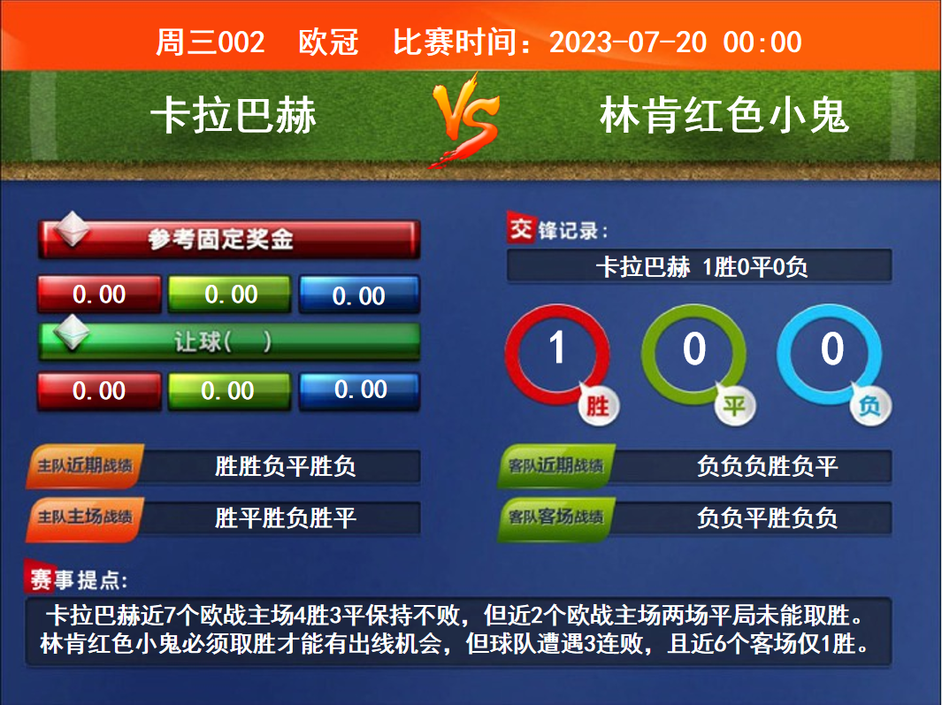 比賽時(shí)間:2023-07-20 00:00賽事提點(diǎn):卡拉巴赫近7個(gè)歐戰(zhàn)主場4勝3平保持不敗,但近2個(gè)歐戰(zhàn)主場兩場平局未能取勝。林肯紅色小鬼必須取勝才能有出線機(jī)會(huì),但球隊(duì)遭遇3連敗,且近6個(gè)客場僅1勝。