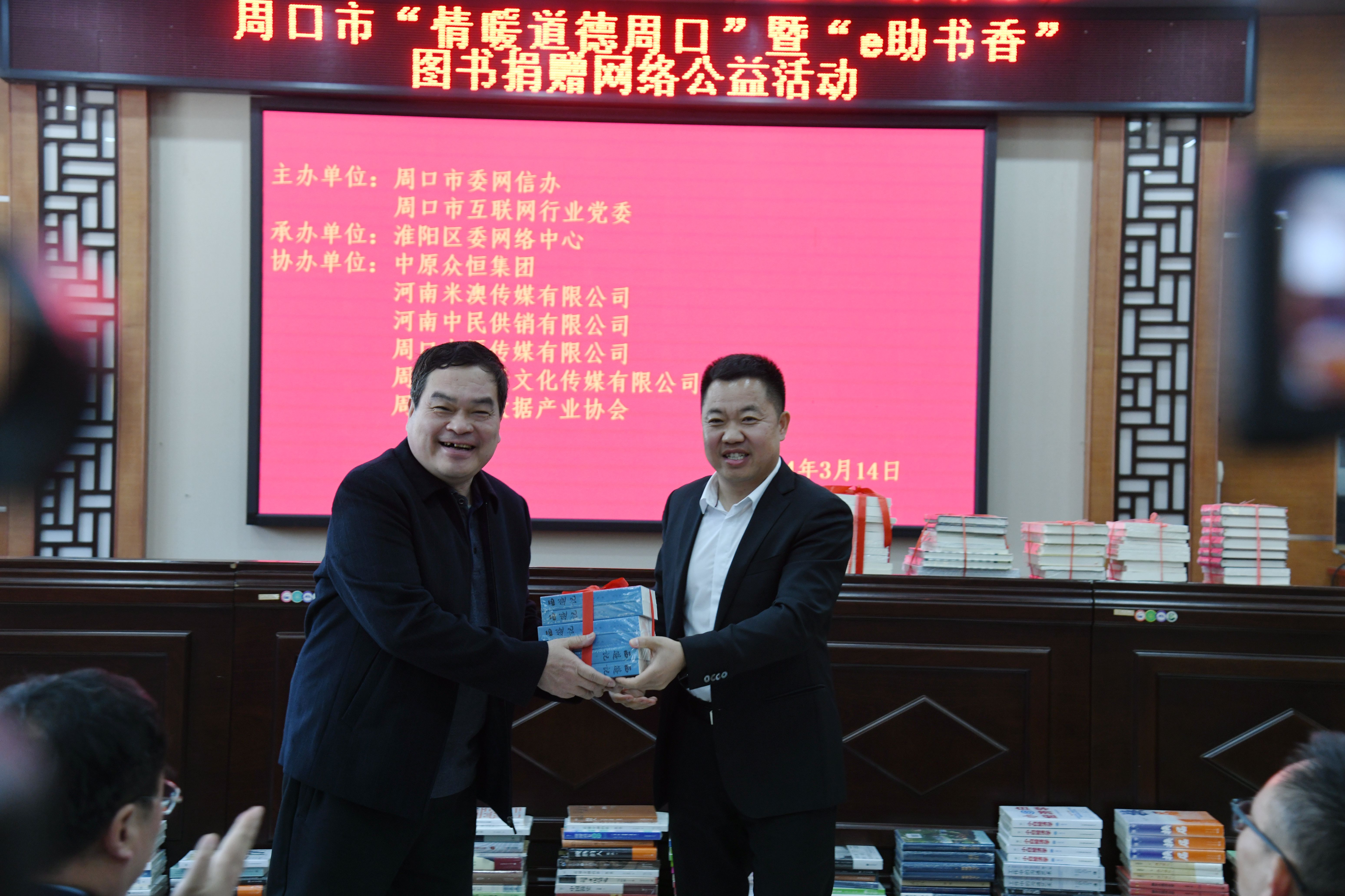 3月14日,由周口市委網(wǎng)信辦、周口市互聯(lián)網(wǎng)行業(yè)黨委主辦的“情暖道德周口”暨“e助書香”圖書捐贈網(wǎng)絡(luò)公益活動在淮陽區(qū)舉行。我市6家愛心企業(yè)聯(lián)合捐贈一批圖書,為正在火熱進行的伏羲書展助上一臂之力。
