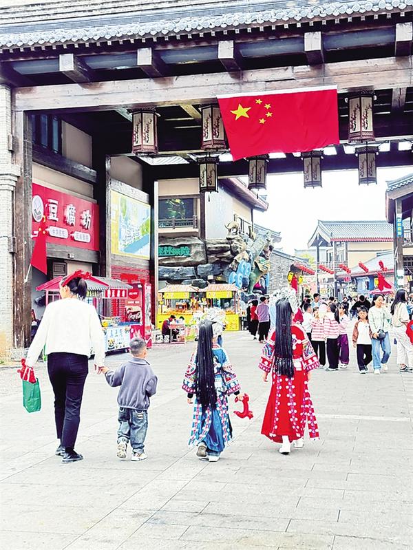 10月7日,游客身著傳統(tǒng)民族服飾,漫步在周口建業(yè)運河古鎮(zhèn)。她們一襲華裳,略施粉黛,與古色古香的建筑融為一體,讓人仿佛置身于一場時空穿越之旅,營造了喜慶的節(jié)日氛圍。