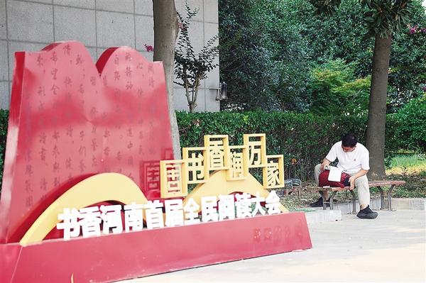 7月15日,在周口市“全民閱讀”標(biāo)牌下,一位市民正坐在樹蔭中,手捧書卷靜心閱讀。