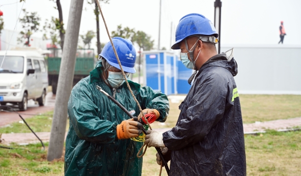 3月25日,在太康縣北環(huán)路核酸檢測(cè)方艙和隔離方艙建設(shè)現(xiàn)場(chǎng),國(guó)網(wǎng)太康縣供電公司工作人員正冒雨施工為其提供電力保障。