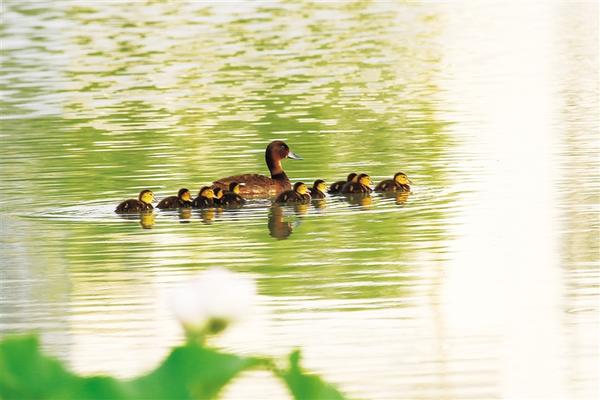 6月24日,世界極度瀕危物種、國家一級保護(hù)野生動(dòng)物青頭潛鴨現(xiàn)身淮陽龍湖。當(dāng)日,一只青頭潛鴨帶著10只可愛的“鴨寶寶”在湖中緩緩游弋。有關(guān)方面人士告訴記者,種種跡象可以證明:青頭潛鴨已在淮陽龍湖國家濕地公園安家落戶、繁衍生息。