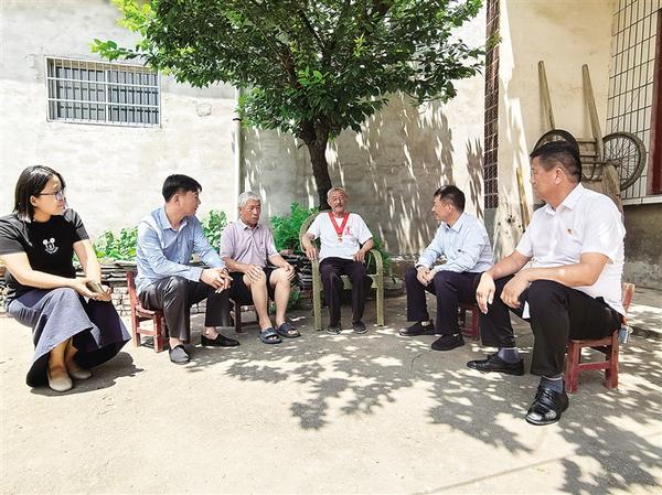 7月1日,沈丘縣付井鎮(zhèn)老黨員楊井明(右三)佩戴“光榮在黨50年”紀(jì)念章,為前來看望他的鎮(zhèn)村黨員干部講黨史。據(jù)了解,1968年7月1日,楊井明正式成為一名中國(guó)共產(chǎn)黨黨員。