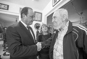 菲德?tīng)枴たㄋ固亓_會(huì)見(jiàn)奧朗德 5月11日,在古巴首都哈瓦那,古巴前領(lǐng)導(dǎo)人菲德?tīng)枴たㄋ固亓_(右)會(huì)見(jiàn)到訪的法國(guó)總統(tǒng)奧朗德(左)。當(dāng)日,法國(guó)總統(tǒng)奧朗德在古巴哈瓦那大學(xué)演講。他在演講中呼吁美國(guó)解除對(duì)古巴的經(jīng)濟(jì)封鎖。奧朗德于10日晚抵達(dá)哈瓦那,開(kāi)始對(duì)古巴進(jìn)行為期3天的訪問(wèn),他是冷戰(zhàn)結(jié)束后首位訪問(wèn)古巴的法國(guó)國(guó)家元首。