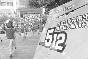 校園地震逃生演練 5月12日,安徽省合肥市蜀山區(qū)第五十中學(xué)(新區(qū))的學(xué)生們?cè)谘菥毜卣鹛由冯x。當(dāng)日是“5·12”汶川地震紀(jì)念日,該校開展逃生演練?;顒?dòng)旨在指導(dǎo)學(xué)生遇到地震時(shí)采用有序、正確的處置方法。