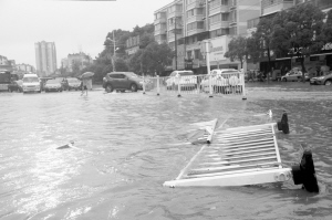 廣西、江西等地遭遇持續(xù)強(qiáng)降雨 中央氣象臺繼續(xù)發(fā)布暴雨藍(lán)色預(yù)警 6月14日,在江西宜春明月北路,路面交通護(hù)欄被洪水沖倒。6月13日起,廣西、江西等地遭遇大范圍強(qiáng)降雨。中央氣象臺14日10時繼續(xù)發(fā)布暴雨藍(lán)色預(yù)警,預(yù)計14日14時至15日14時,湖南東北部和中部、湖北東南部、安徽南部、江西北部、福建西北部、浙江大部、上海以及西藏東南部、云南西部和東南部、廣西北部、廣東中北部、海南南部等地的部分地區(qū)有大雨或暴雨。新華社發(fā)