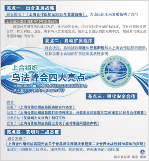烏法,見證金磚國家新開發(fā)銀行籌備工作全面展開,應(yīng)急儲備安排正式啟動;見證上合組織成立14年來首次擴(kuò)員,印度和巴基斯坦加入上合組織的程序啟動,白俄羅斯成為觀察員國,阿塞拜疆、亞美尼亞、柬埔寨、尼泊爾成為對話伙伴國……新興和發(fā)展中國家伙伴關(guān)系日益密切。