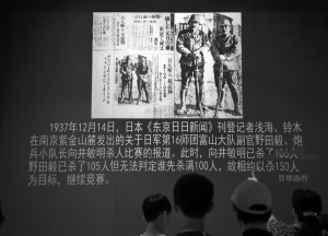 ?。保梗常纺辏保苍拢保慈?,日本《東京日日新聞》記者淺海、鈴木在南京紫金山麓發(fā)出了關(guān)于日軍第16師團(tuán)富山大隊(duì)副官野田毅、炮兵小隊(duì)長(zhǎng)向井敏明殺人比賽的報(bào)道,向井敏明已經(jīng)殺了106人,野田毅已經(jīng)殺了105人,但無(wú)法判定誰(shuí)先殺滿100人,故相約以殺150人為目標(biāo),繼續(xù)競(jìng)賽。