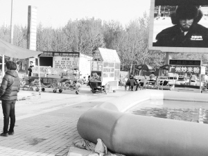 4月8日18時(shí)許,記者在現(xiàn)場(chǎng)看到,廣場(chǎng)的中央噴泉東側(cè)擺了許多攤點(diǎn),有的攤點(diǎn)甚至把桌椅擺到了人行道上(如圖)。在廣場(chǎng)東側(cè)的出入口處,一些賣(mài)飯的商販已經(jīng)將桌椅擺放整齊,不寬的道路被占去近一半。